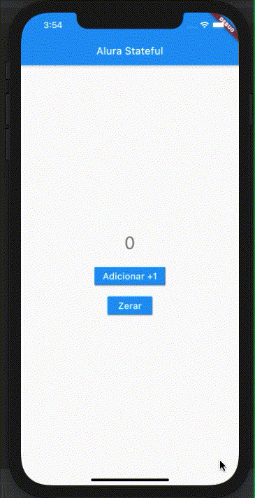 Bora fazer na prática um app que adiciona +1 a um contador e pode ser zerado? Exemplo básico, mas, que nos mostra completamente o funcionamento do Stateful em ação! A Figura abaixo demonstra como ficará nosso app com o estado.